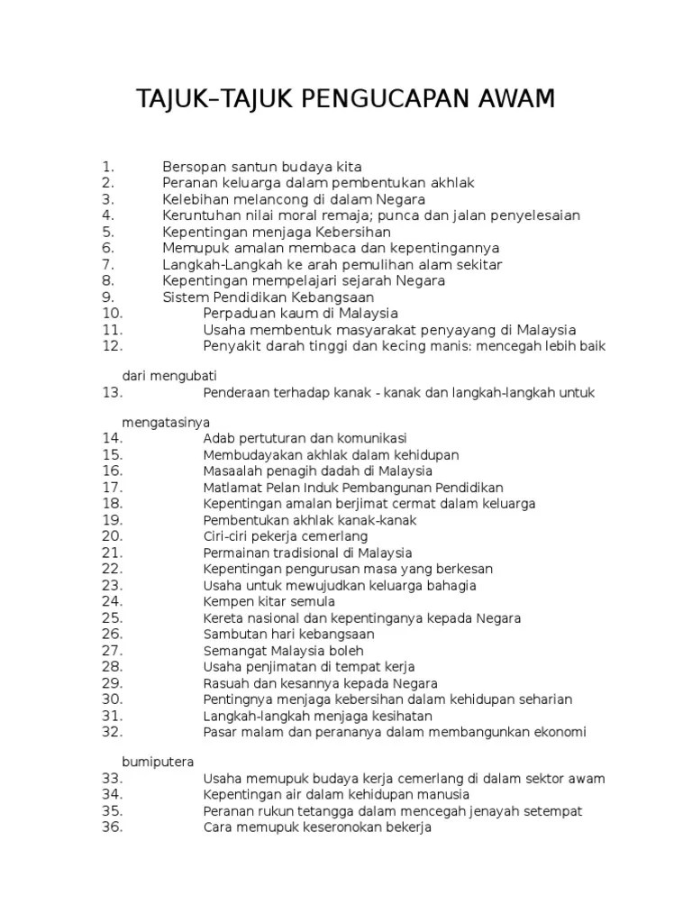 Mencari topik pidato persuasif adalah sukar, tetapi senarai idea ucapan. Jika rakyat negara ini mengamalkan aktiviti senaman, tidak mustahil tahap kesihatan rakyat malaysia akan meningkat. Contoh tajuk pengucapan awam menarik yang ringkas spontan. Di majlis perasmian persidangan kesihatan persekitaran.